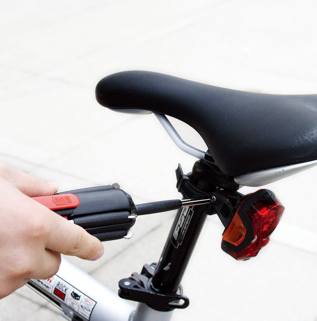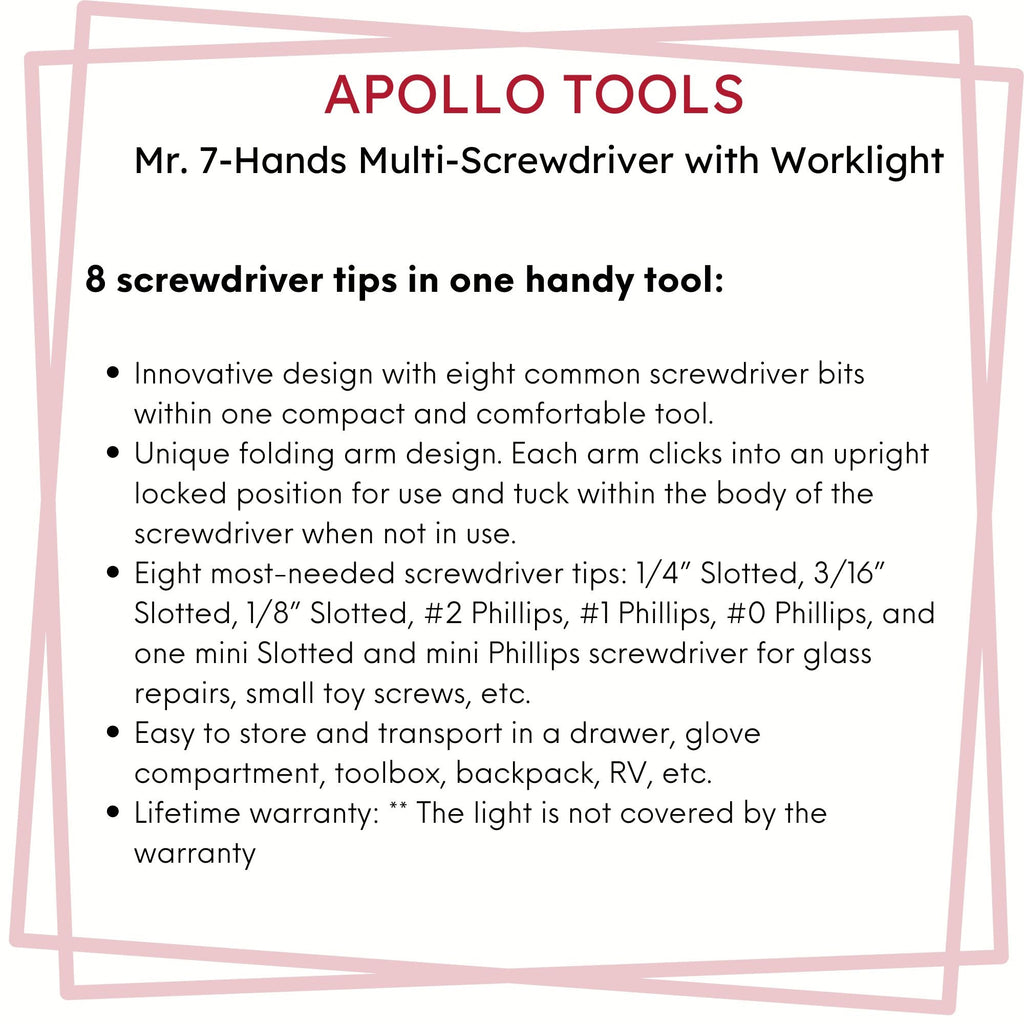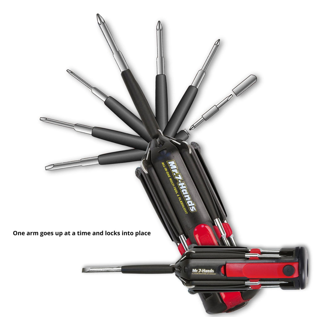 APOLLO TOOLS’ PATENTED Mr. 7-Hands multi-screwdriver has a unique folding arm design. Each arm folds down and clicks as it is tucked within the body of the screwdriver when not in use, and clicks into an upright locked position for use.