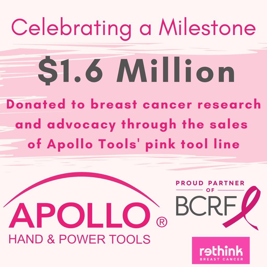 DONATION TO BREAST CANCER RESEARCH.   Apollo Tools, Ltd is donating $0.25 from this purchase to the Breast Cancer Research Foundation®. BCRF’s mission is to advance the world’s most promising research to eradicate breast cancer. For more information about BCRF, visit bcrf.org. You can read more about Apollo Tools' breast cancer commitment here.
