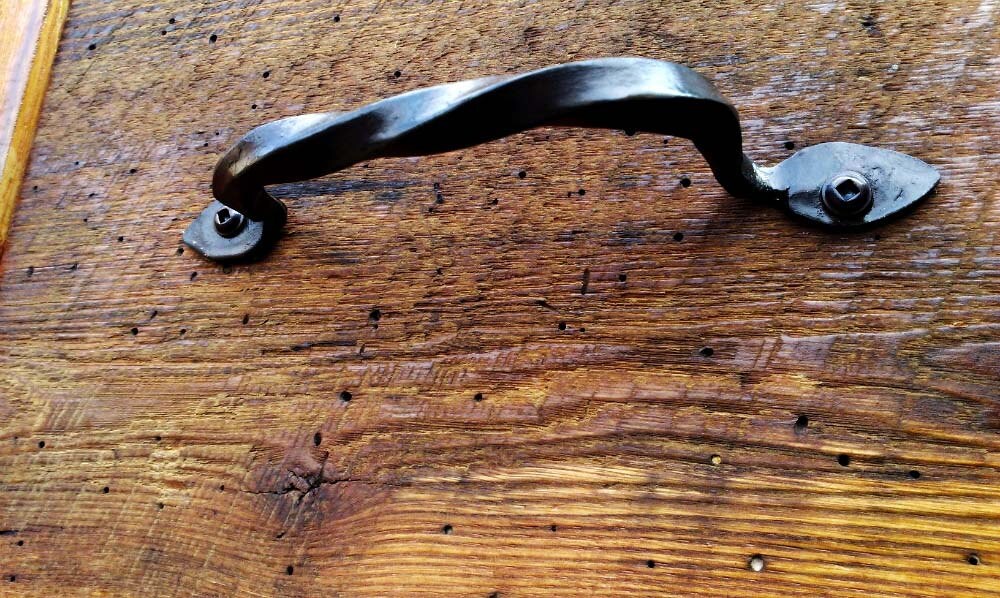 Shown here in rustic wormy chestnut at 60 long with 2 cupboards and 3 drawers. This version has no top, but we do custom wood tops as well.