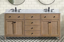 Elevate your bathroom's aesthetic with the 72" Annie double sink vanity, destined to command attention in your renovation. Fashioned with a sturdy solid wood frame, this vanity ensures enduring quality. Its wood finish employs raised grain techniques, imparting a distressed, reclaimed appearance that infuses character into your space. Four soft-closing drawers, equipped with full extension glides, offer generous storage for your daily essentials. Completing the vanity is an authentic Italian Carrara marble countertop, elevating the allure of your farmhouse-style remodel with a luxurious touch.