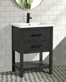 Transform your bathroom with the 24-inch Betty single sink vanity, expertly crafted with solid wood for long-lasting durability. The wood is wire brushed to create a raised grain texture that adds to its distressed and rustic appearance. This vanity features a single solid wood dovetail drawer with full extension glides, providing ample storage space for your daily essentials. Complete with a ceramic countertop, this vanity is the perfect addition to your bathroom remodel.