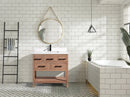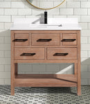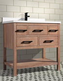 The 36 in. Betty single sink bathroom vanity is a perfect centerpiece for your bathroom remodel. It is skillfully crafted from solid wood to provide long-lasting durability. The wood is wire brushed and finished with raised grain, which gives a distressed and rustic wood appearance. This vanity comes with four solid wood dovetail drawers that have full extension glides, providing ample storage space for your daily toiletries. The vanity is topped with a quartz countertop that adds a touch of elegance to your bathroom remodel.