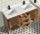 Transform your bathroom with the 55 inch San Diego double sink vanity, which will serve as the focal point of your remodel. The vanity is expertly crafted from solid wood to ensure durability for years to come. The wood is finished with raised grain to create a distressed and reclaimed appearance. The three solid wood dovetail drawers feature full extension glides, providing ample storage space for your daily toiletries. The mid century modern style is completed with a sturdy quartz countertop that complements the design of the vanity.