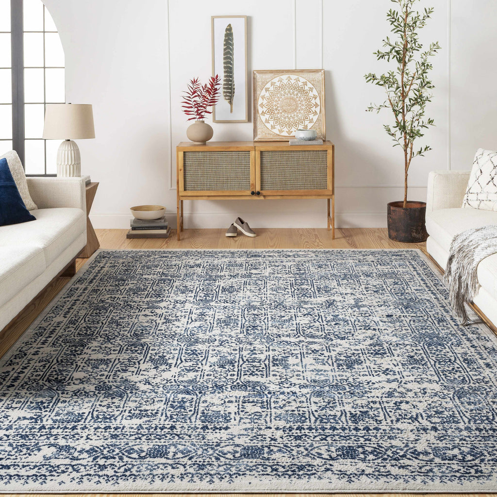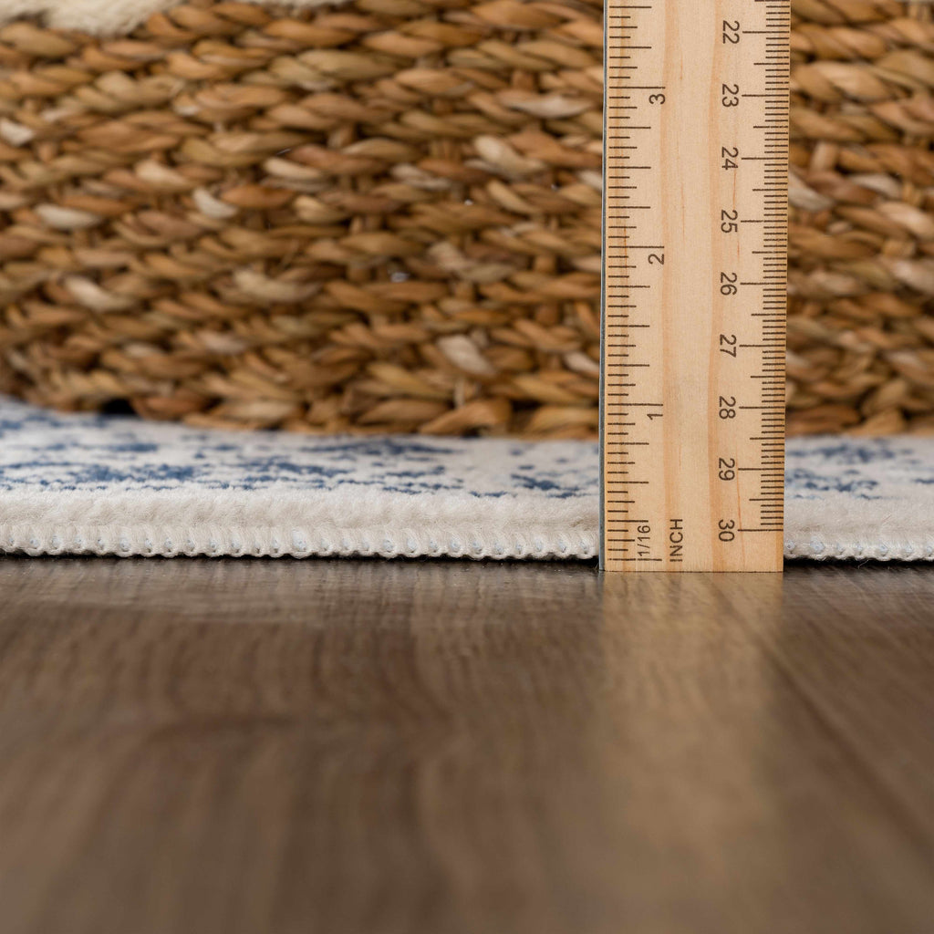 About: This rug features a dark blue, white, cream, and light blue color palette that is perfect for any space. The 100% polypropylene construction is durable and perfect for high traffic areas. The low pile height makes this rug easy to clean and vacuum. Add a touch of traditional style to your home with this soft neutral and blue rug.