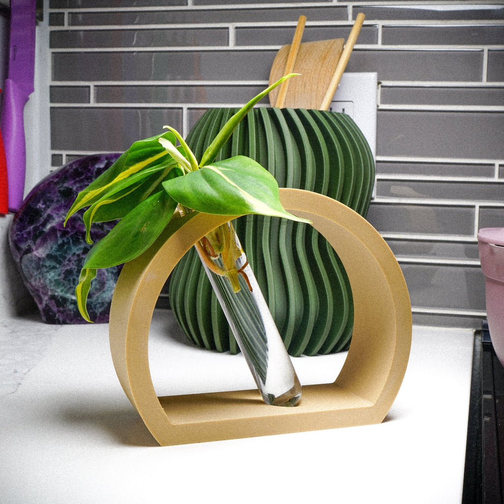 Nordic Semi-Circle Propagation Station that holds one 25x150mm glass tube for your favorite hydroponics plant cutting. This modern and minimalist stand will add a nice touch to any coffee table. Designed with slight slant but will not spill even when water is filled to the top, perfectly etched groove holds the tube in place. Tubes are large enough to hold most plants cuttings. These make for an excellent housewarming gift.