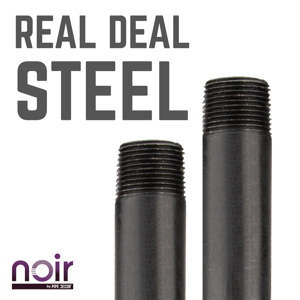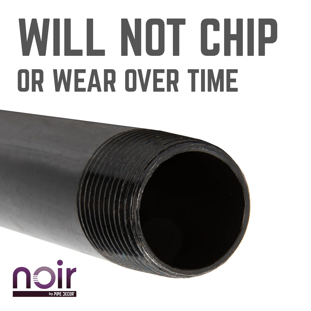 Take your industrial style to the next level with Noir by PIPE DECOR. These prefinished matte black steel pipes truly stand out from the crowd. Noir lends a sophisticated vibe to any PIPE DECOR piece. Build true black pipe legs using our pipes and fittings or create a black clothing rack for your home or retail space. Noir also looks great with brass or galvanized accents. Combine any of our pipe finishes for a one-of-a-kind project that’s unique to you. The beauty of Noir goes below the surface. Unlike electroplated or painted items, our finishing process causes the matte black color to permeate each pipe for a deep tone that will last a lifetime. That means you never have to worry about chips or scratches. While our standard black pipes and fittings are coated in a protective oil during transit, our Noir line comes completely ready to use—no need to clean and seal. It’s laid-back and low maintenance for the DIYer on the go.