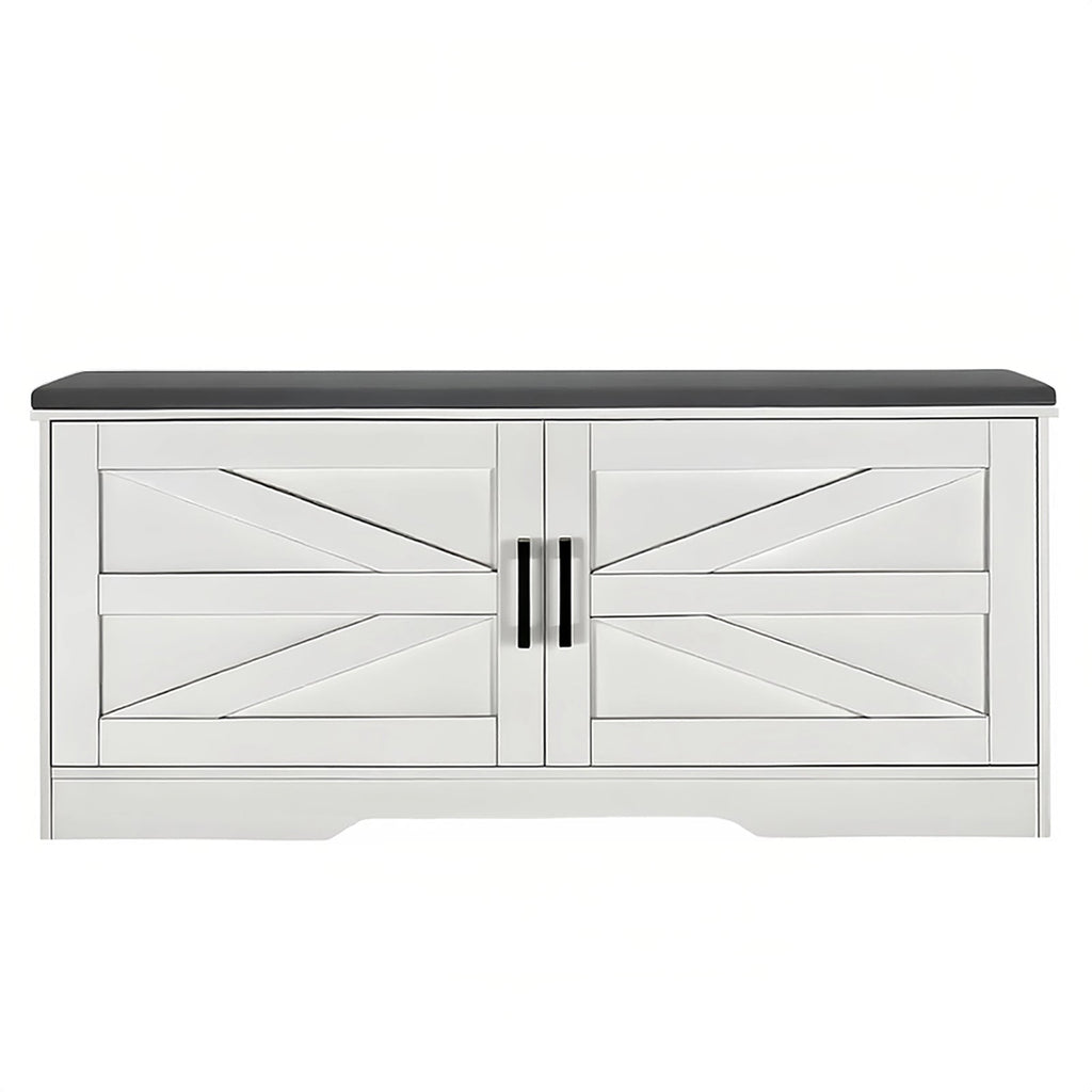 2 Tier Shoe Bench with Padded Seat, 2 Barn Doors and Adjustable Shelves, for Entryway and Living Room, White MDF