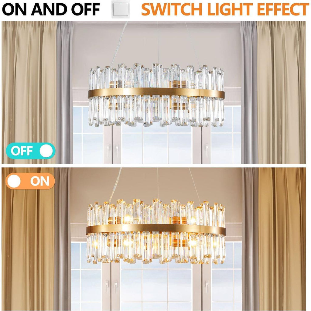 This contemporary chandelier is constructed with a premium iron metal frame and carefully selected crystals, ensuring both durability and an opulent appearance that will elevate your home decor taste.The circular design lends itself to various interior settings, including the dining table, and living room, exuding a sleek and modern style.While this chandelier does not come with bulbs included, it is compatible with various lamp types such as LED bulbs, incandescent bulbs, and energy-saving bulbs. This allows you the freedom to choose the most suitable light source for your needs. With detailed installation instructions and all necessary hardware provided, you can effortlessly complete the installation without requiring professional skills or assistance. This saves both time and money.Although this product does not contain light bulbs, it is recommended to match energy-efficient LED lamps to reduce electricity bills and reduce carbon emissions.