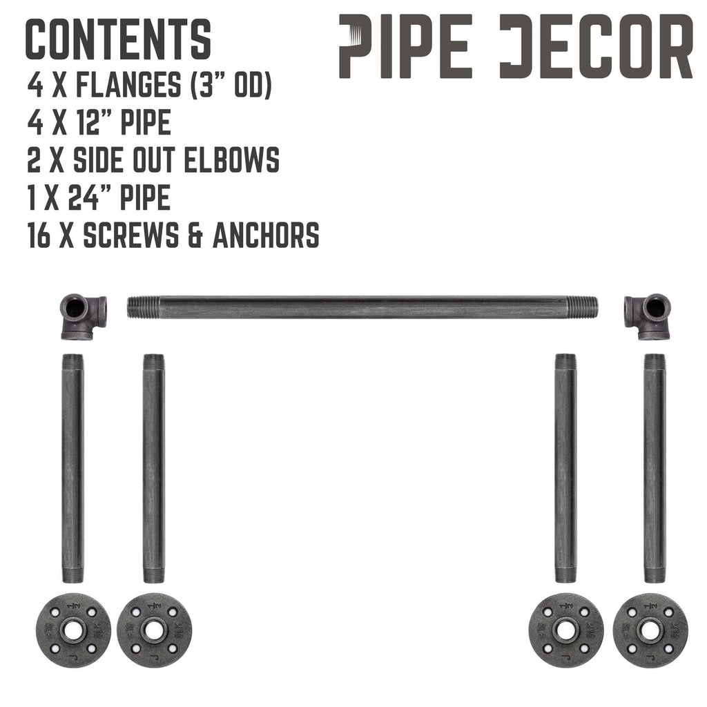 - Kit uses 1/2 in. pipe and fittings; included are (4) flanges, (4) 12 inch pipes, (1) 24 inch pipe, (2) side outlet elbows, (16) screws with anchors