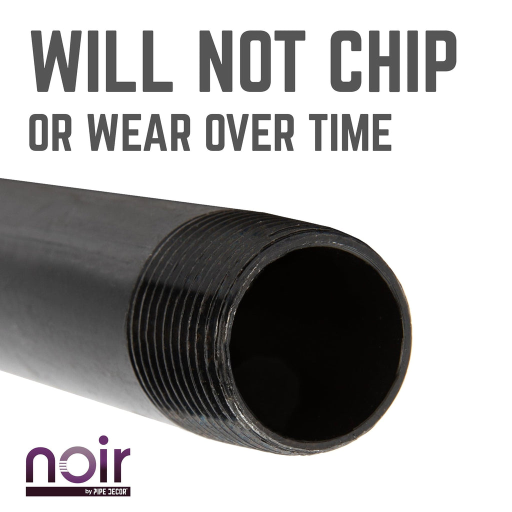 Take your industrial style to the next level with Noir by PIPE DECOR. These prefinished matte black steel pipes truly stand out from the crowd. Noir lends a sophisticated vibe to any PIPE DECOR piece. Build true black pipe legs using our pipes and fittings or create a black clothing rack for your home or retail space. Noir also looks great with brass or galvanized accents. Combine any of our pipe finishes for a one-of-a-kind project that’s unique to you. The beauty of Noir goes below the surface. Unlike electroplated or painted items, our finishing process causes the matte black color to permeate each pipe for a deep tone that will last a lifetime. That means you never have to worry about chips or scratches. While our standard black pipes and fittings are coated in a protective oil during transit, our Noir line comes completely ready to use—no need to clean and seal. It’s laid-back and low maintenance for the DIYer on the go.