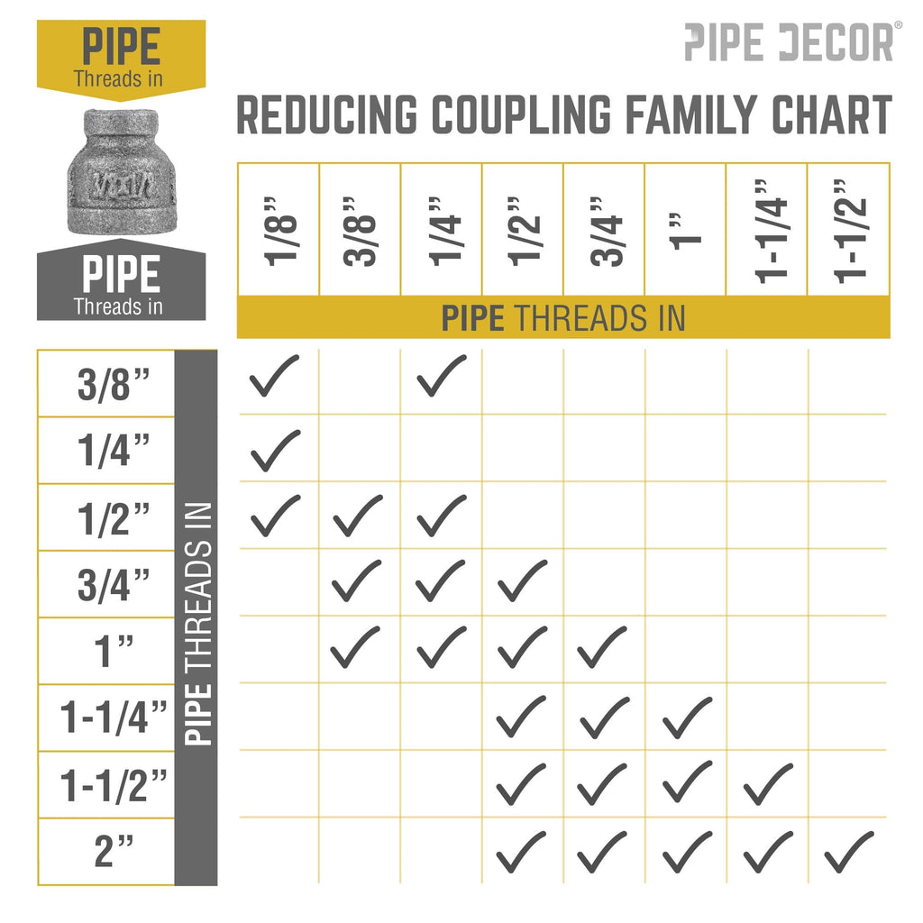 These cylindrical fittings are used to connect two pipes of different diameters. You can use a reducing coupling to add height or length to table legs, bar stool legs, clothing racks, and more by attaching two pipes together. Our fittings are made with durable, industrial-grade malleable iron. Fittings are 100% authentic and are made to stand the test of time. You will know PIPE DECOR parts and accessories when you hold them. Beauty and beast. Strength and style. These are real industrial fittings for your decorations and designs. Accept no substitutes. Extra pieces and accessories are available for your custom projects and expansions. Plug and play as desired.