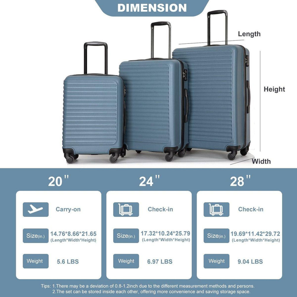 - 3 pcs Luggage Set 20" is carry-on, 24" and 28" are check-in.They can be stored inside each other, offering more convenience and saving storage space.