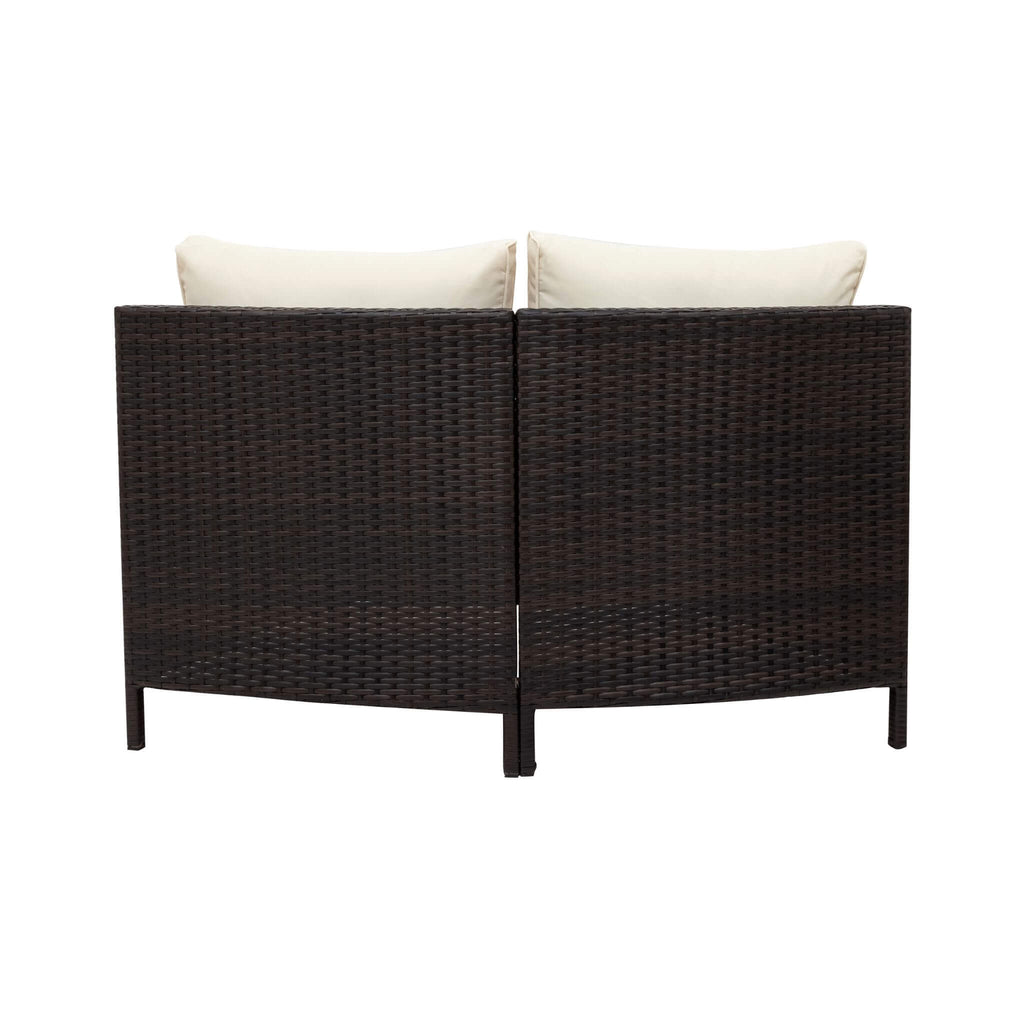 This sectional is as adaptable as your lifestyle. Its modular design allows the pieces to be rearranged into countless configurations, from an intimate nook for romantic evenings to a social layout for lively gatherings. With its neutral beige tones and elegant rattan texture, it complements any outdoor aesthetic. This set was made for those who appreciate beauty, simplicity, and the value of multi-purpose design.
