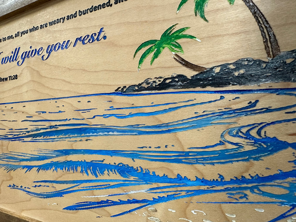 Bible Verse Decorative & Secure Wall-Mounted Gun Cabinet - Matthew 11:28 and Coastal Scene