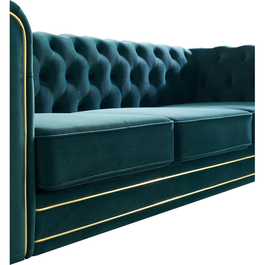 - This Chesterfield sofa features gold strip trim and deep button tufting that adds classic glam style to your living room.