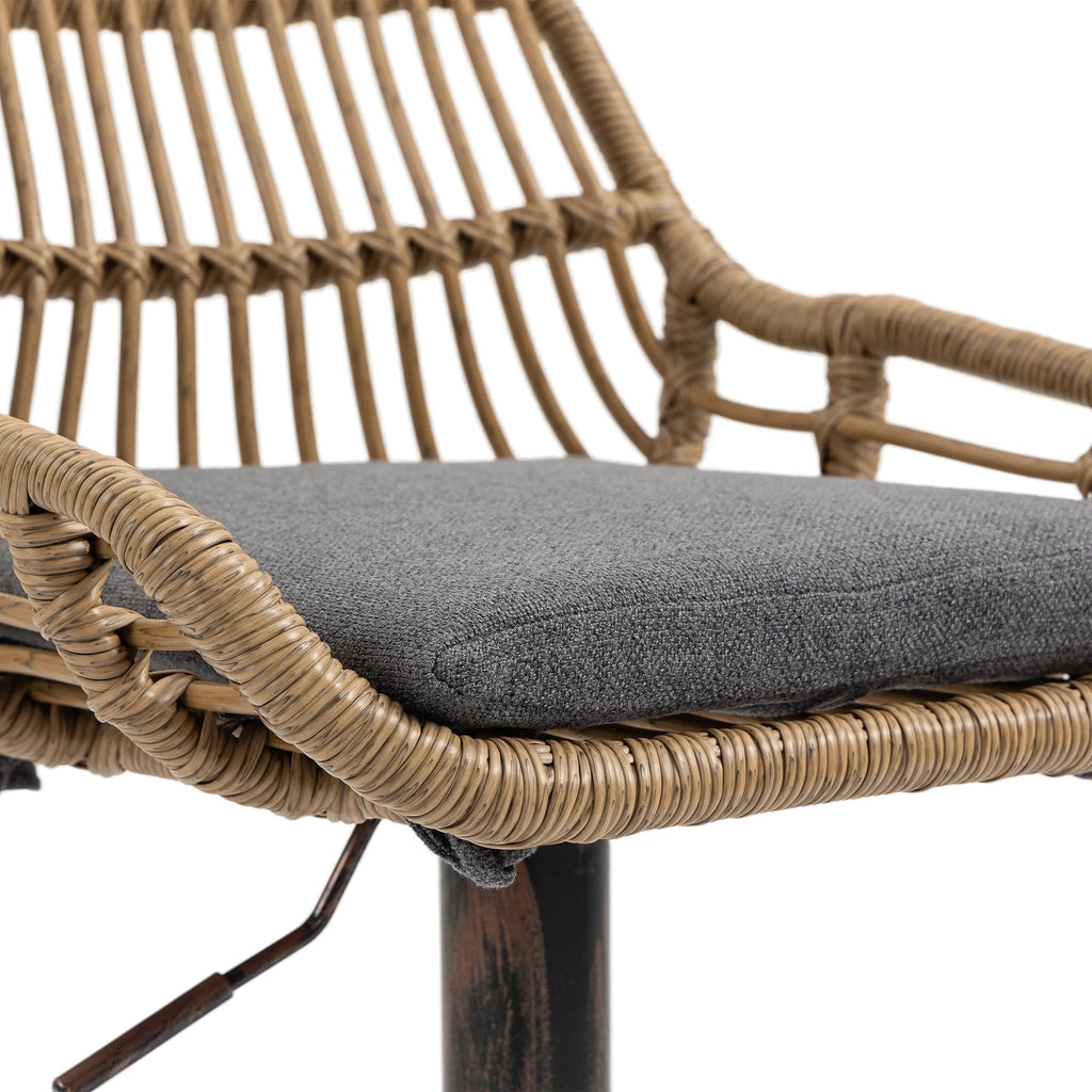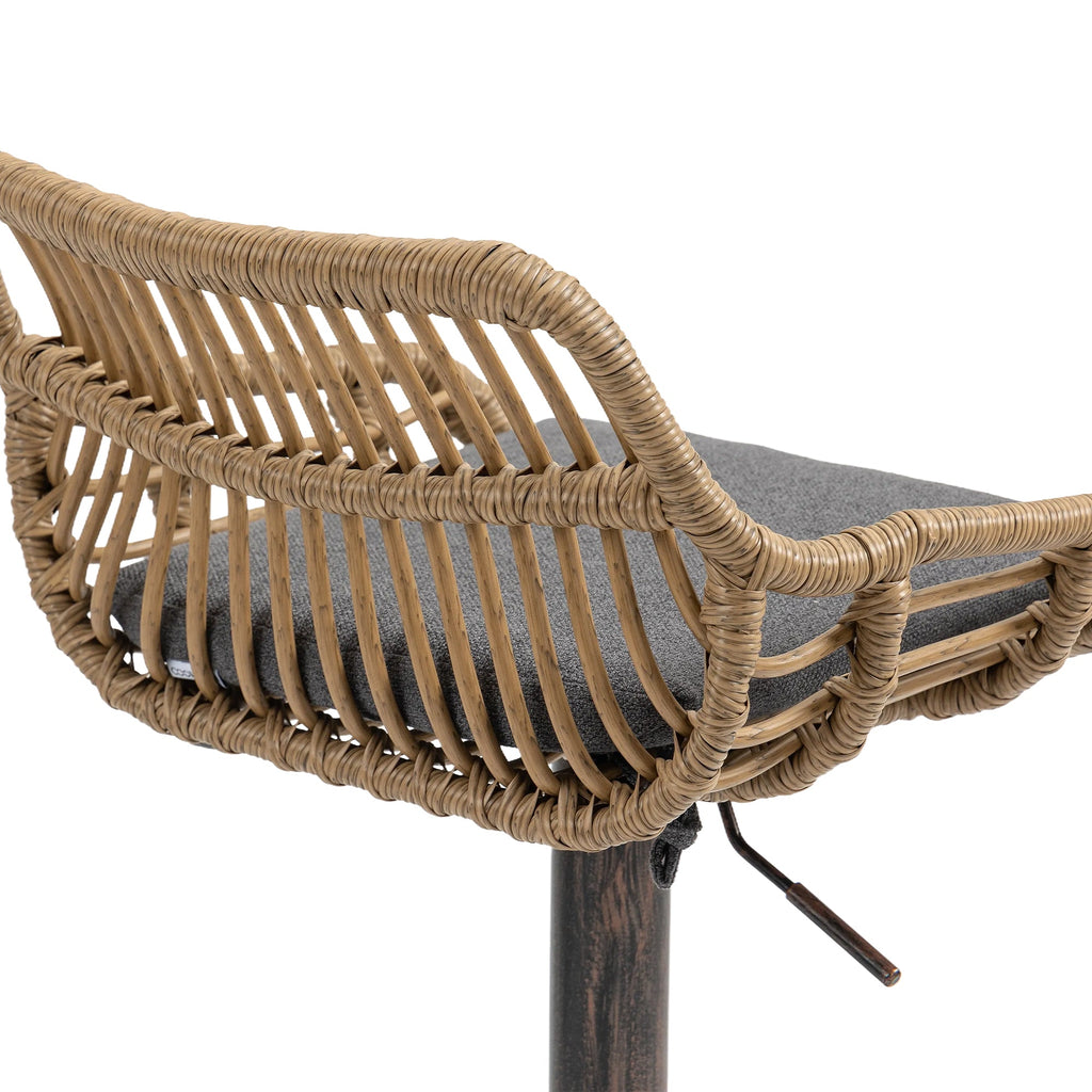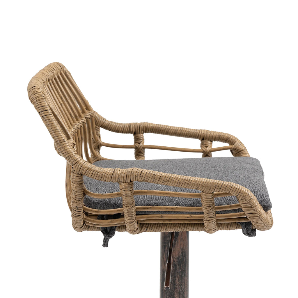 Suitable for indoor and outdoor use, this bar chair features a metal disc base at the bottom and a woven backrest on the back, allowing the chair to rotate 360° and the pole to be adjusted up and down.