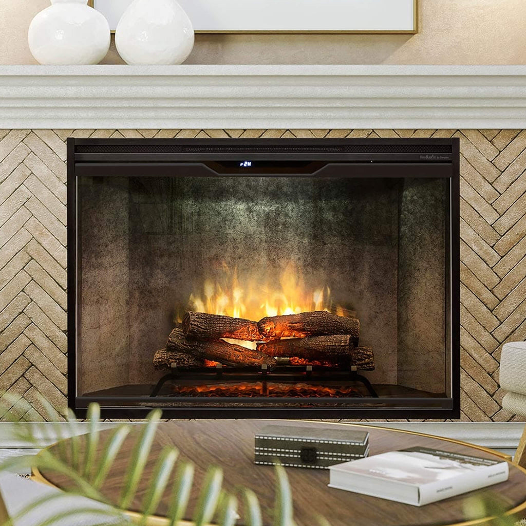 - Revel in the lifelike charm of a full grate of hardwood-cast logs, meticulously tiered for enhanced depth, complemented by a 270-degree herringbone brick interior adorned with natural soot markings.