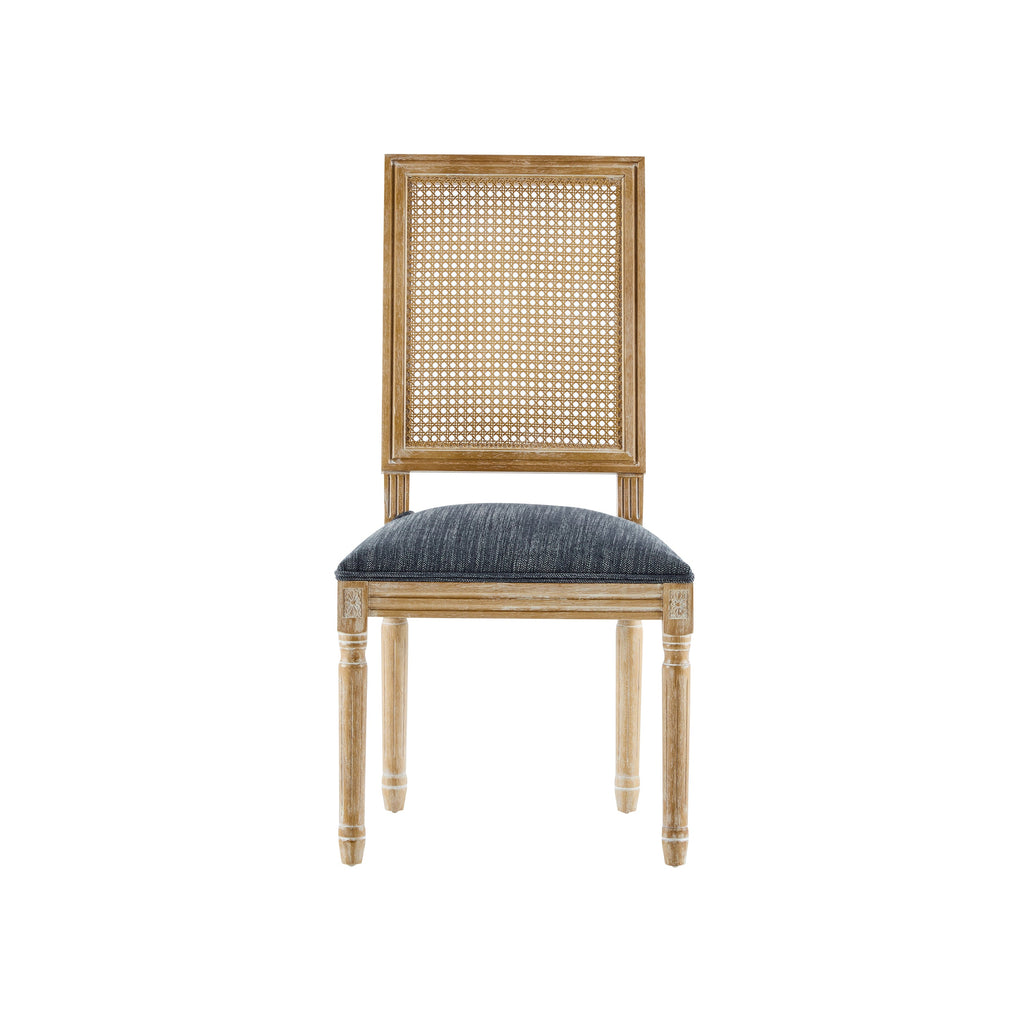 - FRENCH COUNTRY INSPIRATION: Meticulously designed with a touch of sophistication, these chairs transform your dining space into a work of art. Inspired by French country aesthetics, the set of two dining chairs showcases a sleek rectangular cane backrest, elegantly upholstered seats, and slender fluted legs. This unique combination adds a distinctive charm to your home while staying true to its timeless, vintage elegance.