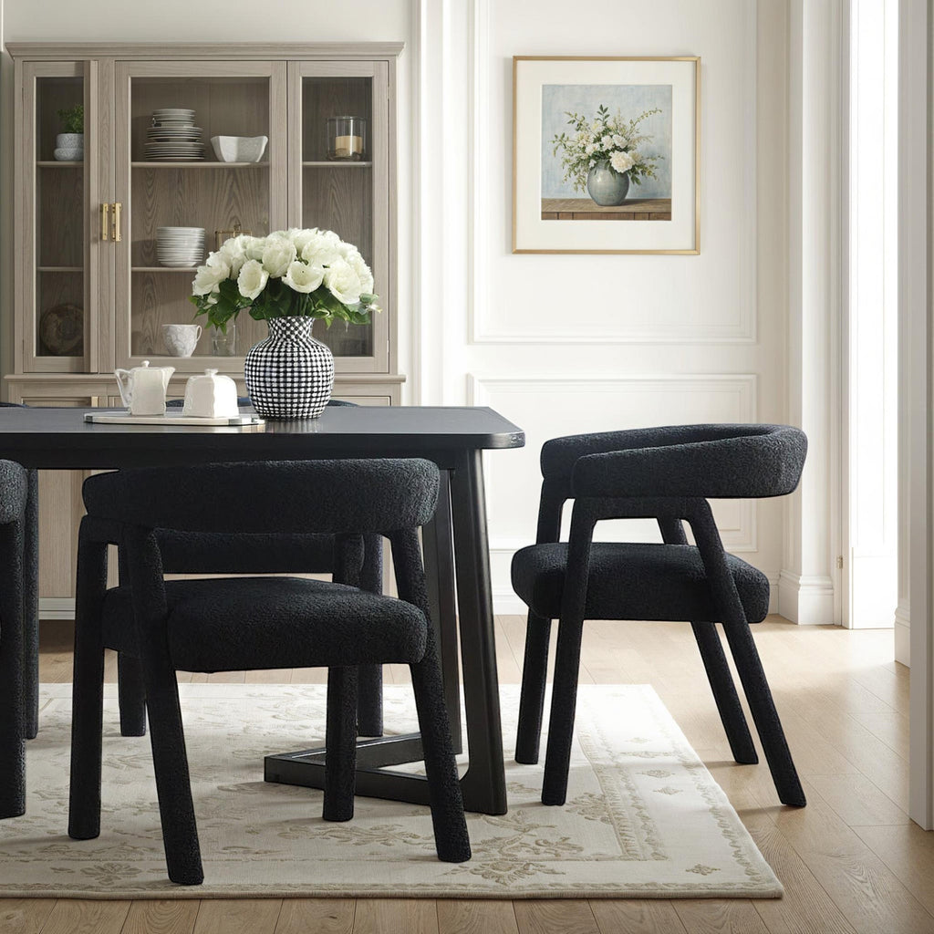 Cozy and sophisticated? Dreams do come true. The Modern Boucle Solid Wood Rounded Back Dining Chair gives you an elevated look and feel that is on par with the high-end designs you’ve seen all over Pinterest. It’s like a fancy, sculptural accent chair and your favorite oversized lounge chair all wrapped in one perfect package. The curved design and wrap-around armrests give you all the comfort you need for prolonged sitting, while the soft, textural boucle fabric is both inviting and effortlessly stylish. Made from solid rubberwood, this chair is built for everyday use. Whether you’re dining with friends, studying, working, or just scrolling on your laptop, this fully upholstered beauty has your back, both literally and figuratively.