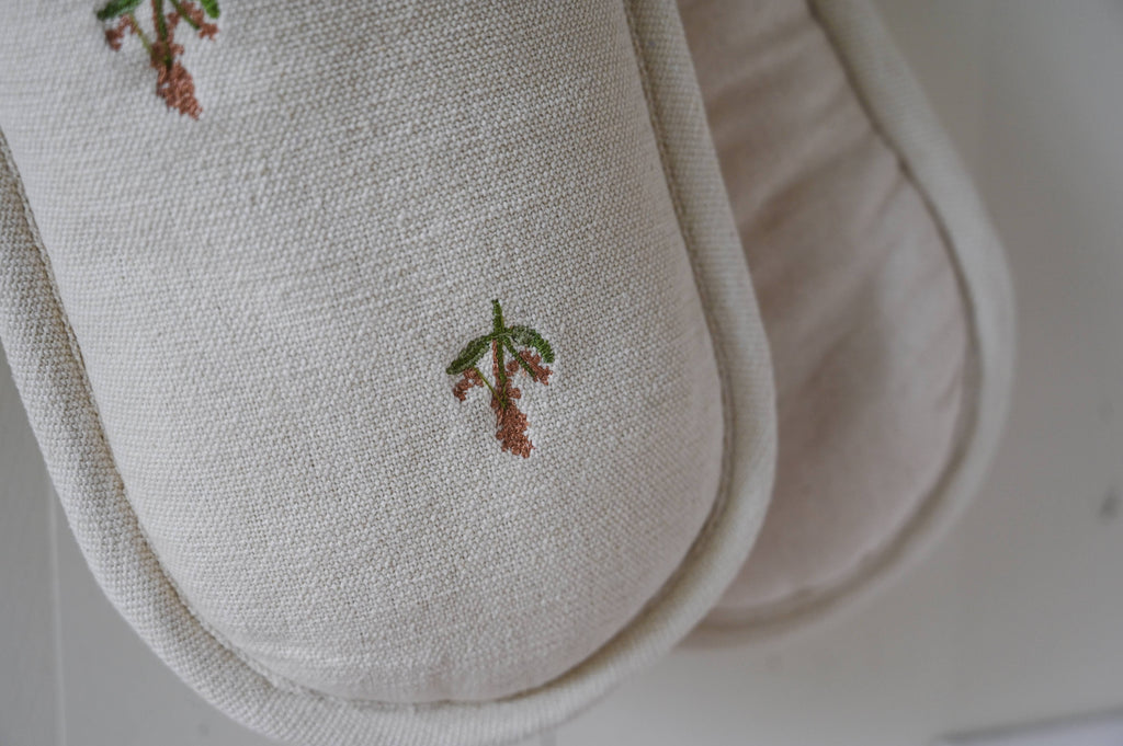 Our double oven mitt features embroidered florals on a cream/natural fabric. The two padded pockets provide your arms and hands protection from hot dishes. This darling double oven mitt also features a loop to hook and display in your kitchen. Whether you’re pulling out a favorite dish from the oven or draping over your oven door, this oven mitt will do the job looking effortlessly beautiful.
