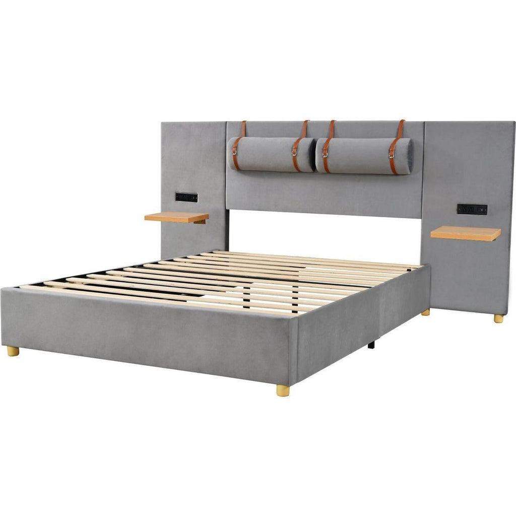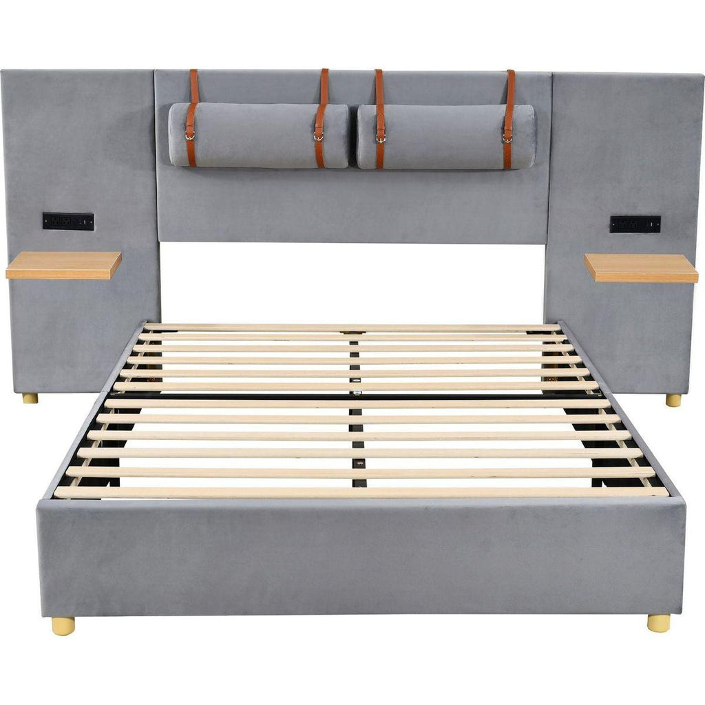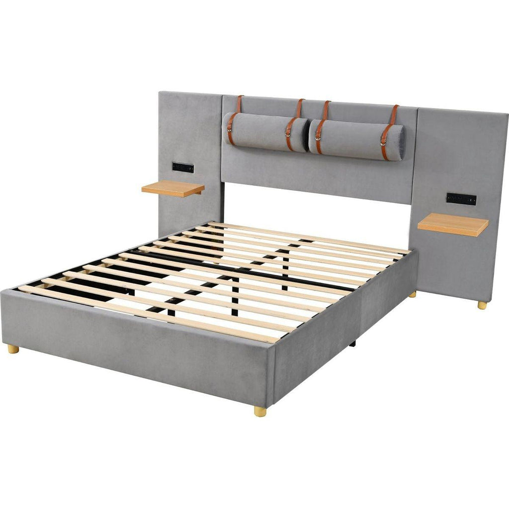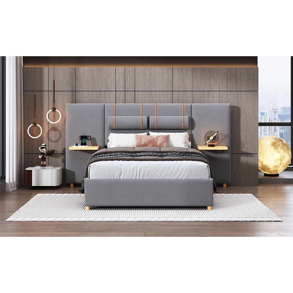Built-in power outlets and USB charging ports on both sides of the headboard for easy device charging.Enjoy luxurious comfort with a plush upholstered headboard featuring two built-in pillows for added support.Convenient bedside storage shelves on both sides of the bed to keep essentials within reach.Upholstered in premium velvet fabric available in two sophisticated colors: beige and grey, enhancing both comfort and elegance. Queen size bed frame with a sturdy construction supporting up to 500lbs, providing ample space and durability.Elevate your bedroom with this stylish and functional upholstered bed, designed to blend modern convenience with luxurious comfort.
