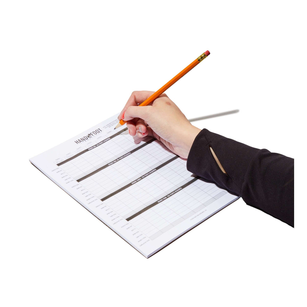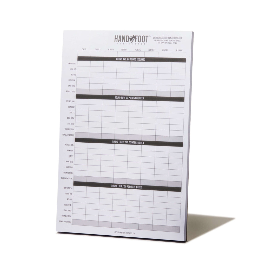 Our Hand & Foot Remastered Scorepads are printed double-sided on 60 sheets of high-quality paper and, at 7 X 10.5 inches, allow for up to 8 players with large blocks to write in.