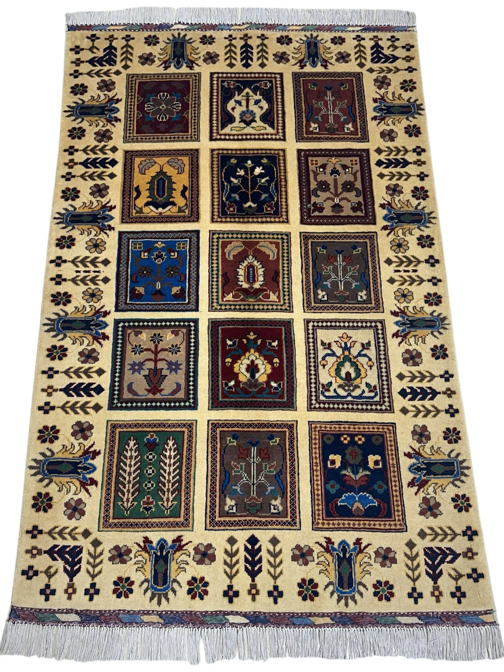 This hand-knotted bakhteiari rug features rich color tones and traditional Afghan weaving. Made with high-quality wool on a cotton foundation, it offers both beauty and durability. Ideal for adding character and texture to entryways, living rooms, or studies.