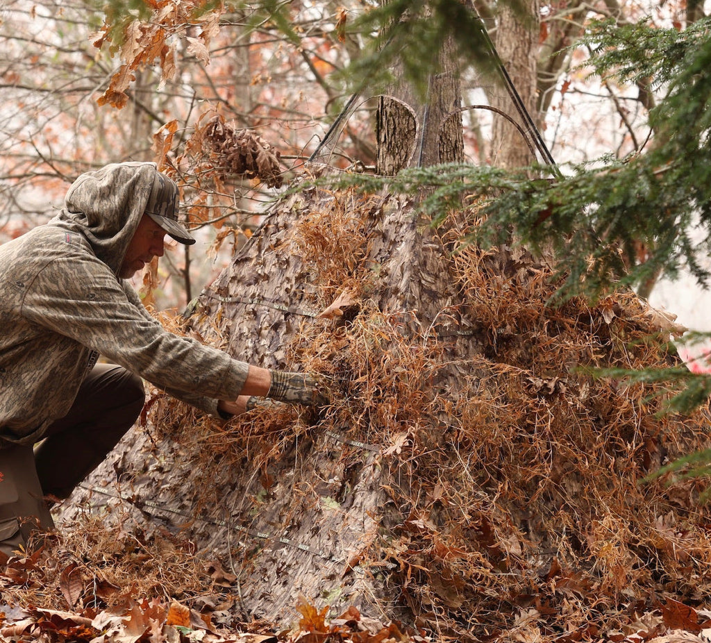 Nukem Grab & Go Hunting Blind, a versatile and lightweight ground blind designed for hunters who prefer mobility and convenience. This blind features a 3D Leafy Mossy Oak Country Roots camo pattern, providing optimal concealment with the camo pattern on the front and back.