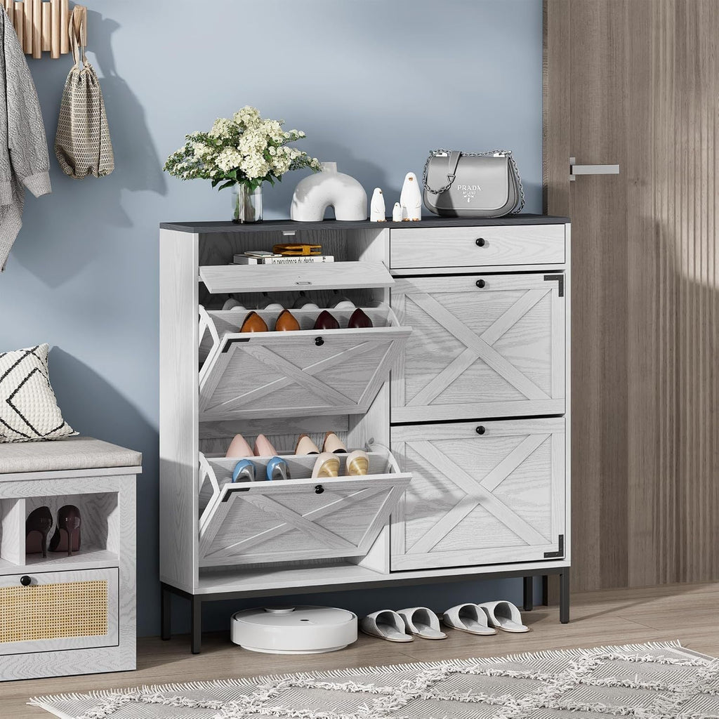 Large Shoe Cabinet with 4 Flip Drawers, Freestanding Shoe Cabinet Organizer with Metal Drawer Bracket, Shoes Storage Cabinet for Entryway, Narrow Shoe Rack Cabinet, White