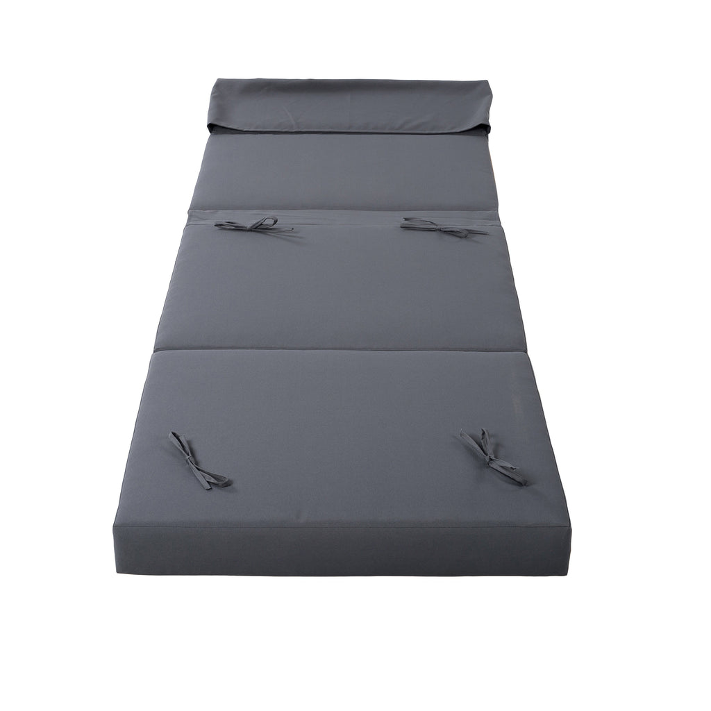 • DIMENSIONS :-Chaise: 79'L × 37.75'W × 34'H (max recline) with 27.5' foldable section .-Cushion: Cushion: Measuring 76.75'L × 27'W with a contoured design, this cushion features a thicker 5.75' headrest section for optimal neck support, transitioning to a 4' base thickness for full-body comfort. The innovative tri-fold design allows for easy folding and compact storage when not in use.