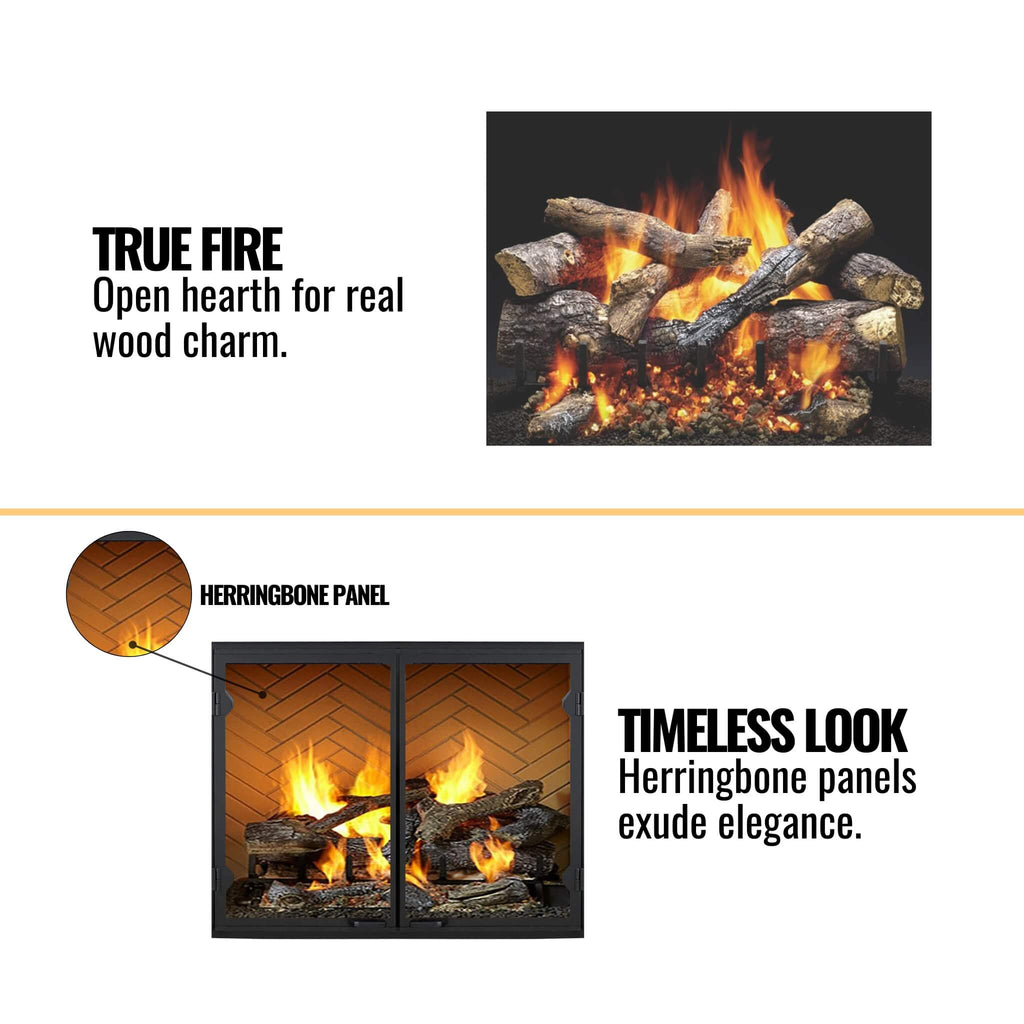 Enhance your experience with the option of adding gas log sets, combining the raw beauty of an open fire with the modern convenience of gas. Whether installed flush with the floor or on a raised hearth, the Biltmore's stunning herringbone interior panels and traditional look bring a touch of grandeur to any home.