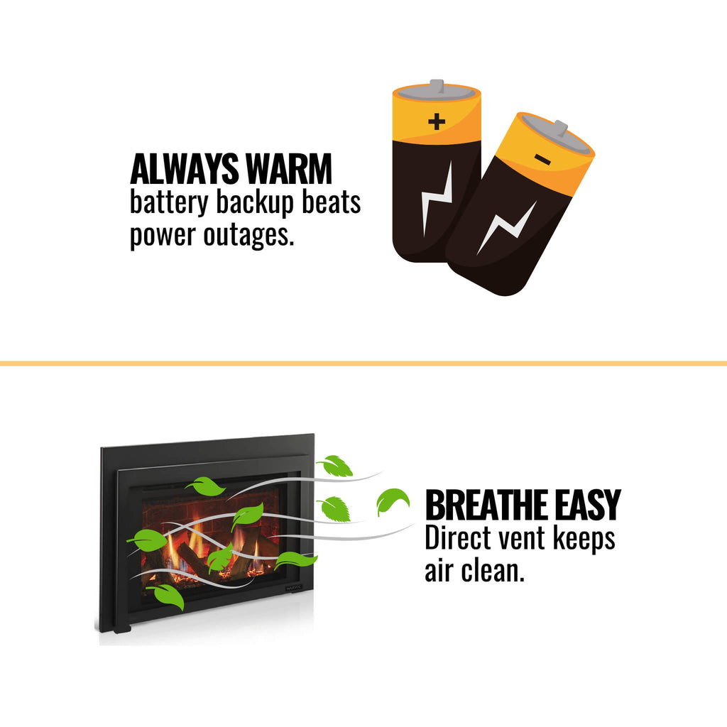 - Safeguard your indoor air quality with our efficient direct vent system. It effectively expels fumes and combustion exhaust outside, ensuring a clean and safe environment in your home.