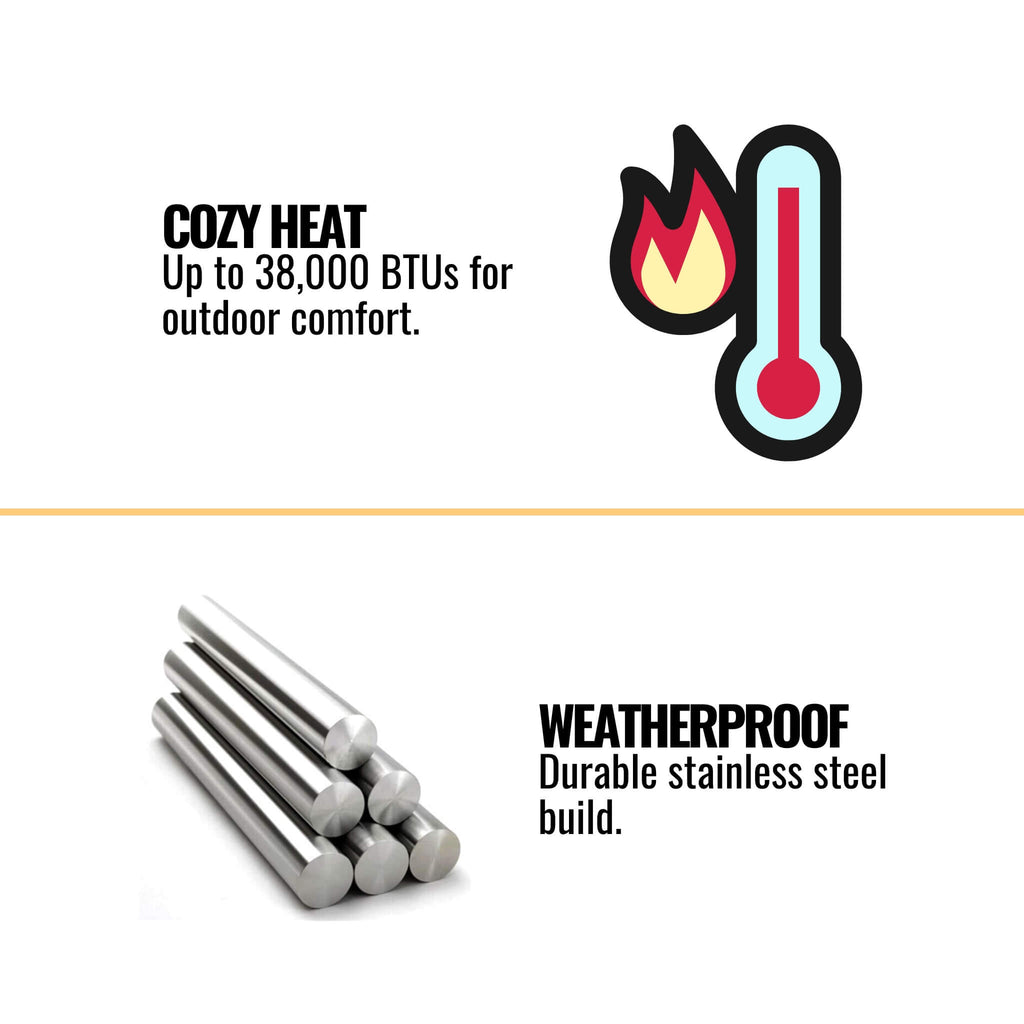 - Enjoy warmth and comfort with up to 38,000 BTUs, perfect for keeping you and your guests cozy during cool evenings. This fireplace ensures that your outdoor gatherings are enjoyable all year round.