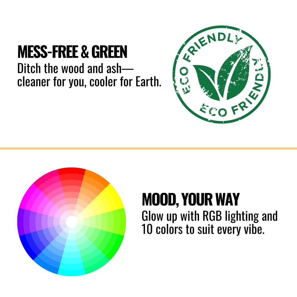 • With high-intensity RGB lighting, independently controlled up lighting, down lighting, and flame colors, you can create the perfect atmosphere. Choose from 10 unique colors to match your mood or decor.