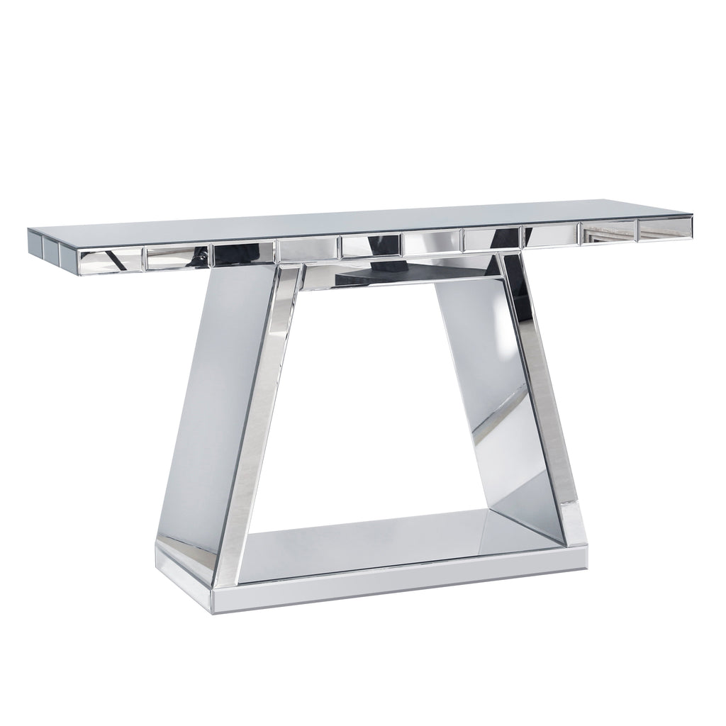 This 55.9' oversized mirror entryway table redefines luxury with its 360° reflective design, featuring polished mirrors on every surface—from the top to the trapezoidal base. Perfect for hallways, living rooms, or staircases, its high-gloss finish amplifies light and creates an illusion of spaciousness, ideal for compact spaces or homes craving a modern, airy aesthetic.