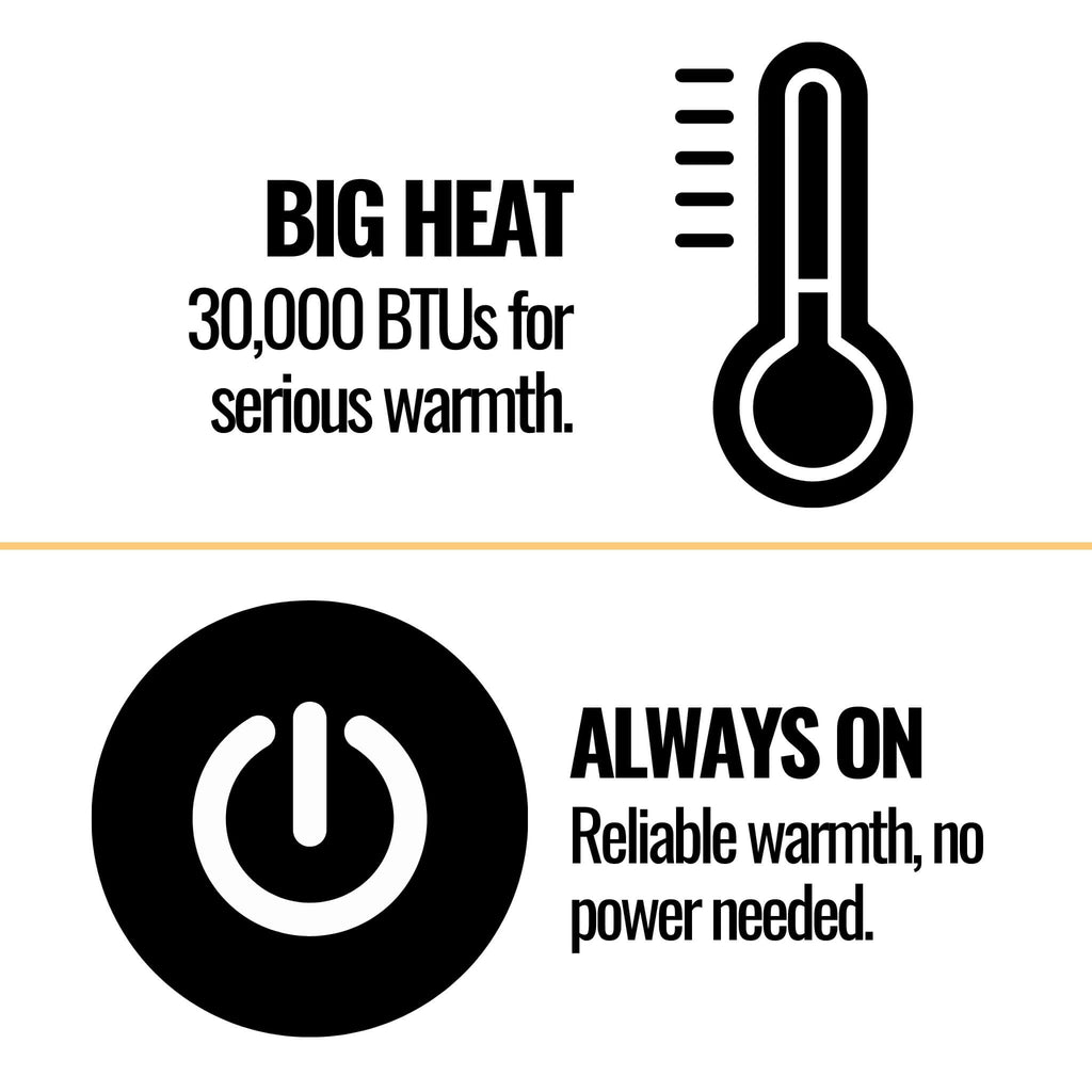 - Experience robust warmth with up to 30,000 BTUs. This high output ensures that even larger spaces are heated effectively. Enjoy a comfortable environment no matter how chilly it gets outside.