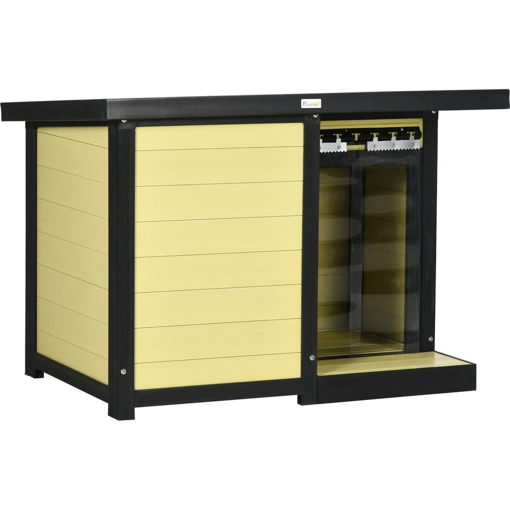 - Reliable Material: Our outdoor dog house is constructed of wood-plastic composite material, resistant to rain, and big enough for medium-sized dogs within 44 lbs, and body length not exceeding 19.75".