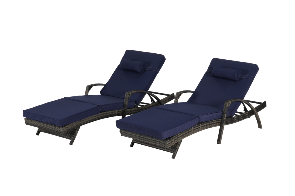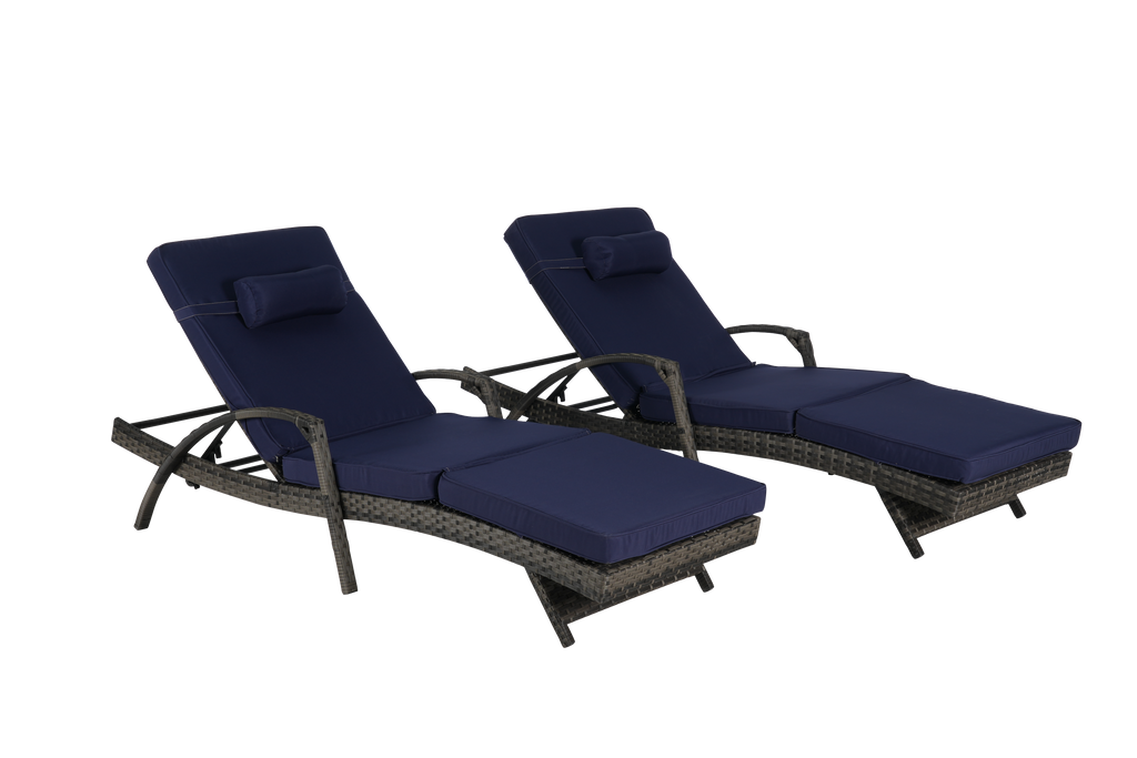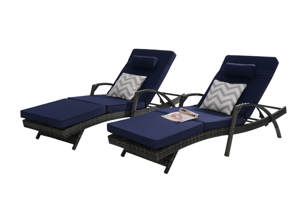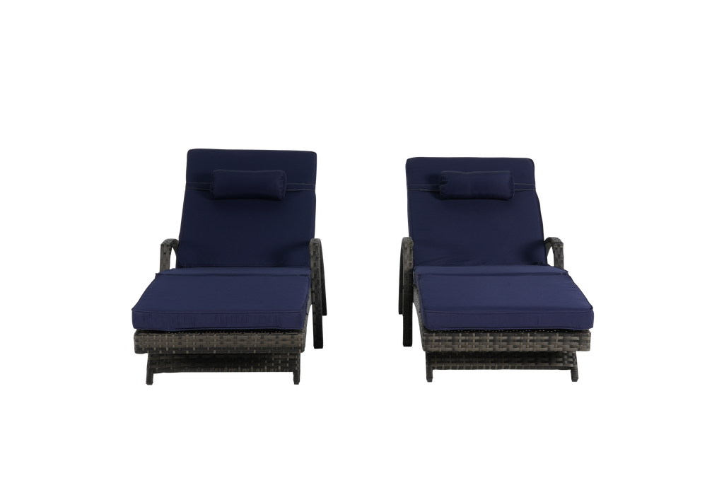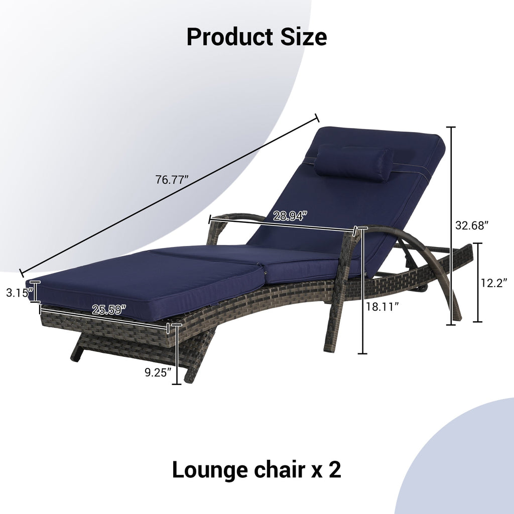 Product Description Product Size: 76.77*24.8*12.6 inch Net weight :61.73 lbs Gross weight : 66.14 lbs Color : Gray Rattan + Deep Blue Cushion Cushion Thickness:3.2 inch Single sofa Load bearing: 600 LBS has 5 adjustable angles for you need Product Features 【Classic & Functional】:This rattan lounger is ideal for sunbathing and relaxing outdoors by yourself, whether it's in your garden, patio, balcony. The 2-piece chaise lounge set of all-weather PE rattan and padded cover set goes well with most outdoor furniture.It's light portable,easily removable and can be perfect outdoor to invite over a friend,tan outside sipping tropical drinks and even more commercial use in the open air. 【Sturdy & Durable】Made of premium PE rattan and rust-resistant steel frame, this outdoor rattan chaise chair is stable and solid which has a long lifespan, while also including a cushion. Metal wrapped in rattan: Powder coated, rust-resistant steel ensures a strong and stable base, with the PE wicker making this reclining rattan garden furniture sturdy, durable, easy to clean and resistant to UV and light water damage. Adjustable backrest: This rattan day bed can be changed to five different positions for an angle which suits you – whether fully relaxing or reading a book. Weather resistant- can be put both indoor and outdoor; Good breathablity, good for our health; Anti-UV- fadeless; Eco-friendly,odorless; Strong-durable; Easy to clean, use wet cloth or wash it directly with a hose