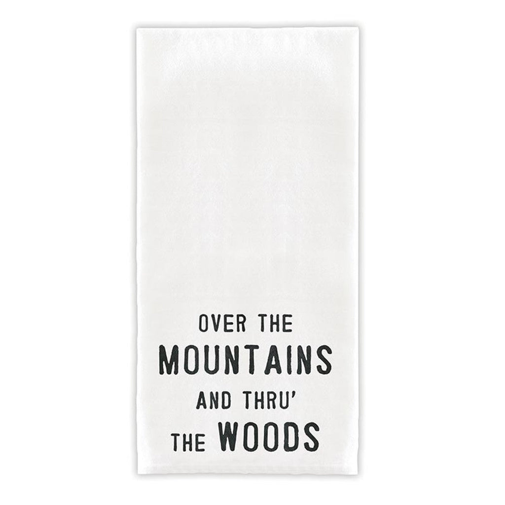 Wrap yourself in the charm of the Over The Mountains Tea Towel in White, crafted from 100% Cotton Flour Sack material for superior absorbency. The whimsical print that reads "Over The Mountains And Thru The Woods" adds a touch of rustic elegance to your kitchen decor, making it a thoughtful gift choice for nature lovers and outdoor enthusiasts alike.