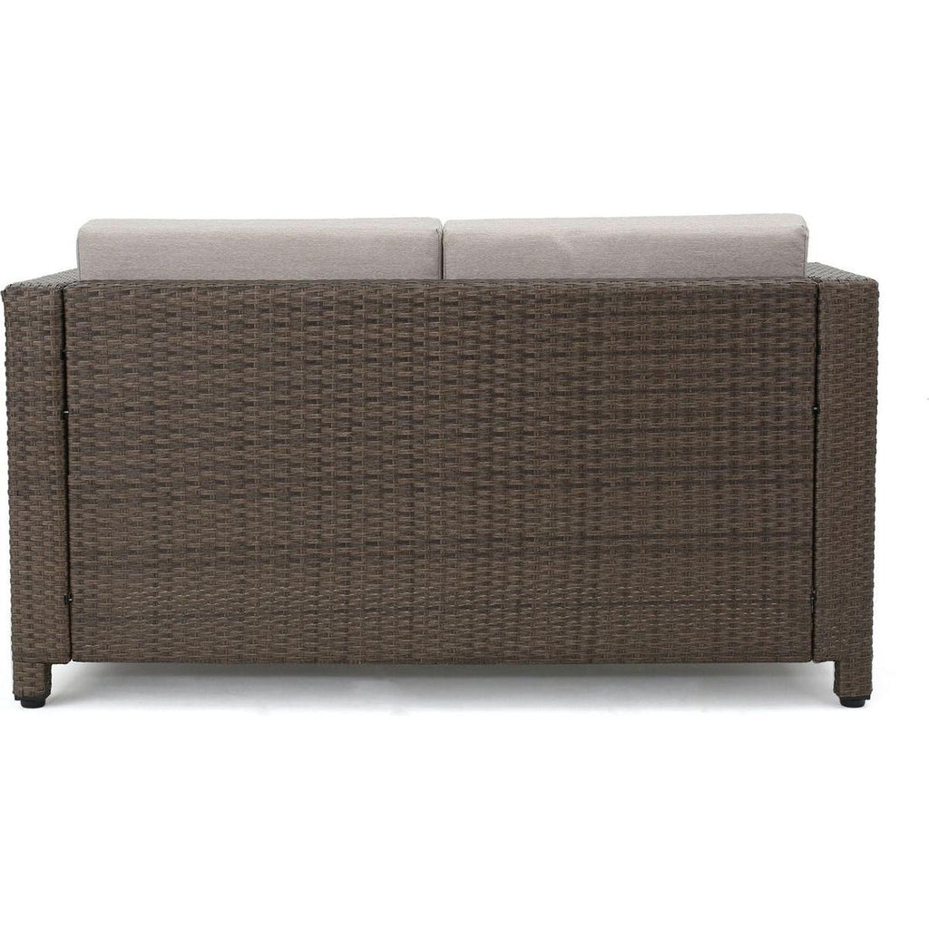 - Includes: One (1) Loveseat, Material: Polyethylene Wicker, Frame Material: Iron, Cushion Material: Water Resistant Fabric