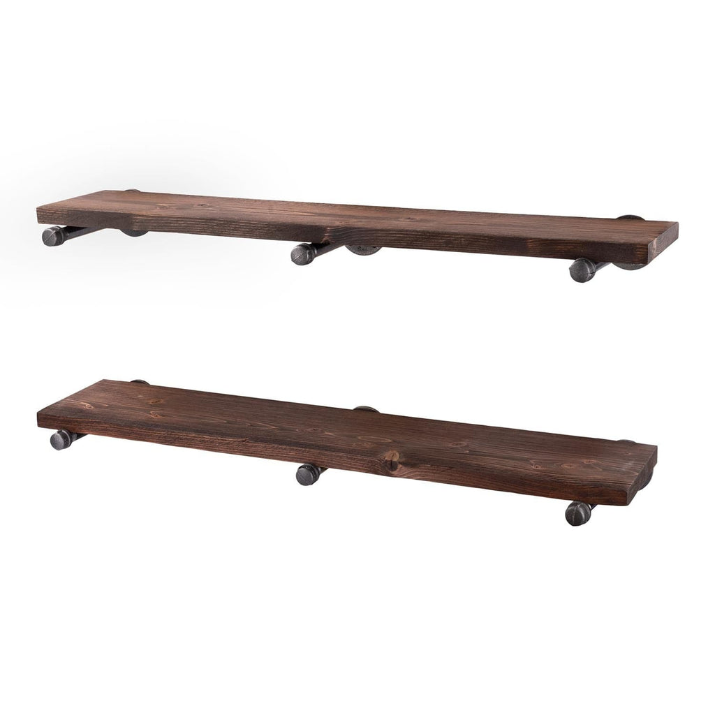 Accent your space with a genuine industrial pipe and real American wood shelf set. Our latest Pipe Decor shelves are comprised of genuine industrial pipes, flanges and sustainably-sourced Ponderosa pine lumber. These heavy-duty shelves make an excellent complement to any bar, den, garage or space of your choosing and fit across a spectrum of vintage to modern design styles. We have taken extra care in assembling this set and want you to know that you are getting a quality product made with real pipe and genuine USA pine. The included wooden boards measure 1 in. x 7.5 in. x 36 in., the kit includes 2-boards and 6-brackets. Assembly is required. All necessary screws and anchors are included.
