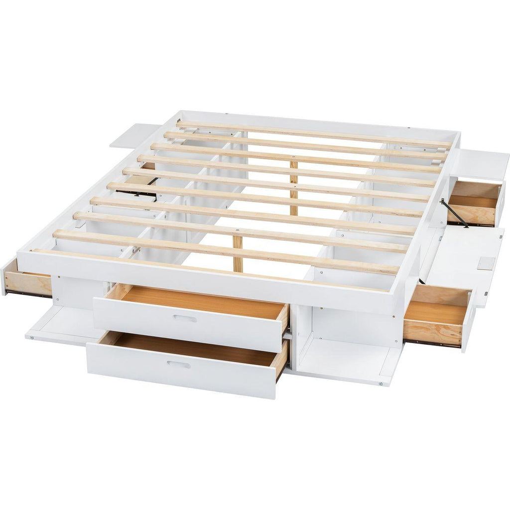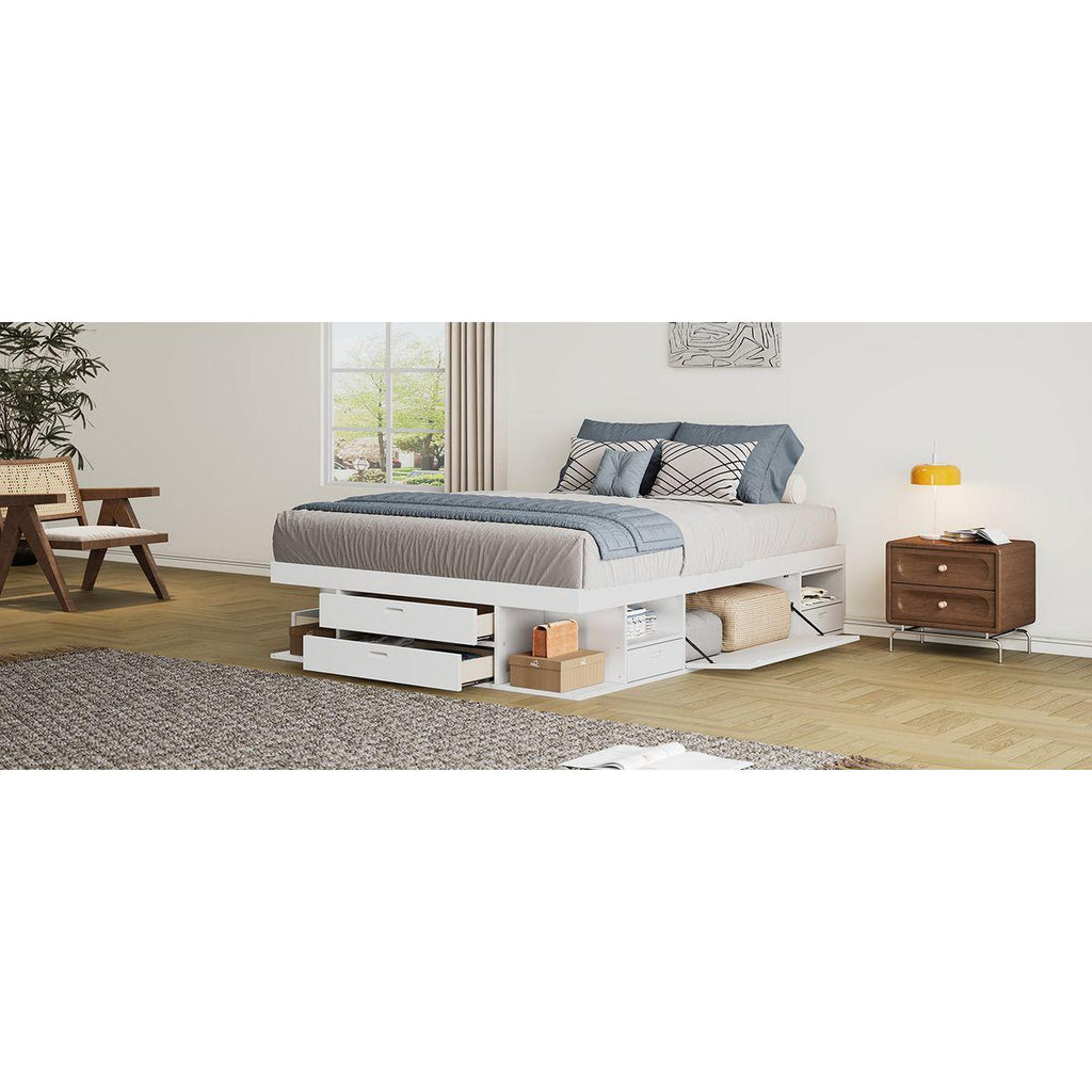- Large Storage Space:The bed has six drawers, six shelves, two compartments with doors and also two pullout shelves, that work well as a nightstand, for your favorite frame, reading books, coffee cups, cellphone charger or alarm clock.