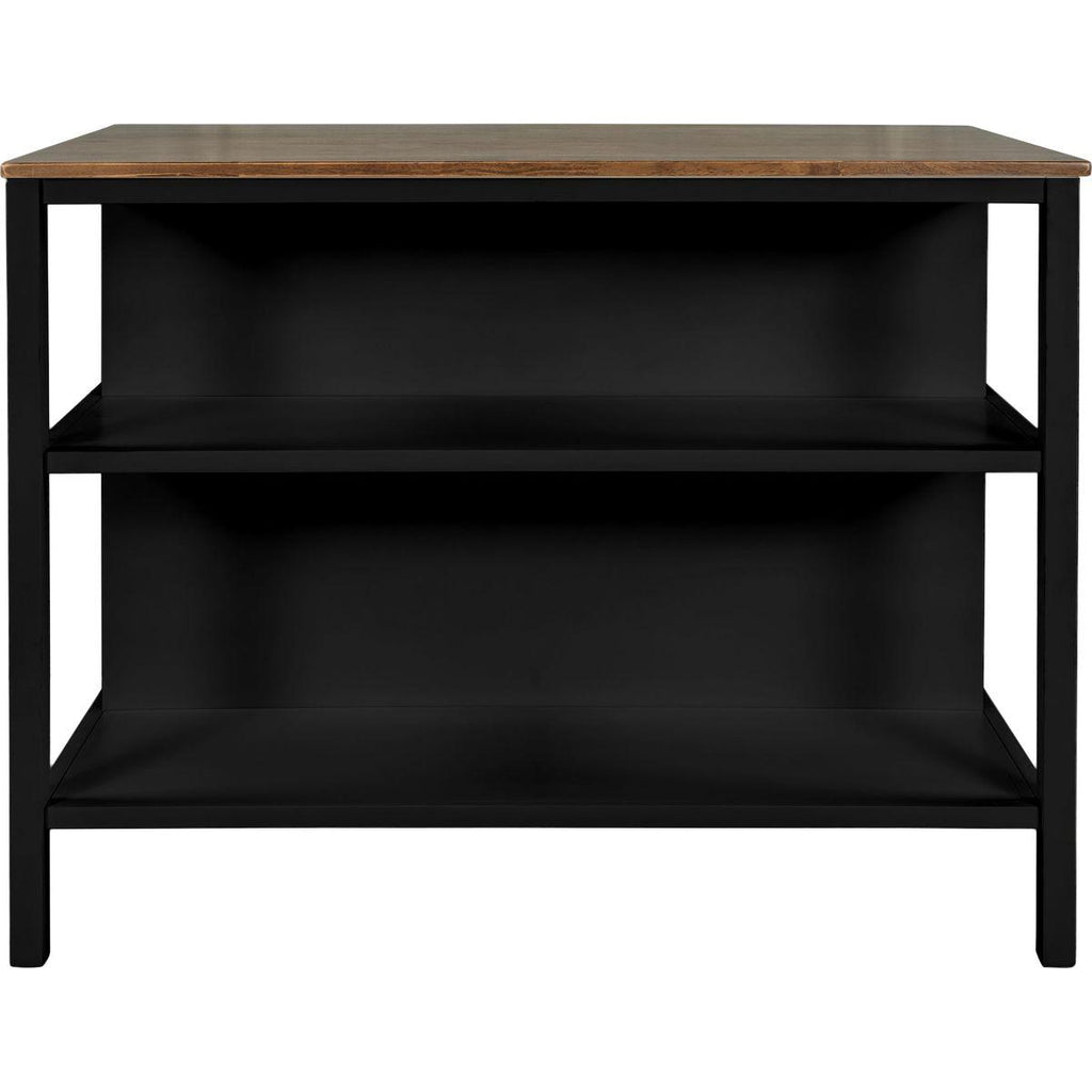 For this kitchen island, it has 2 convenient full length open shelves underneath the tabletop. To organize all those extra pans, pots even a small microwave oven.