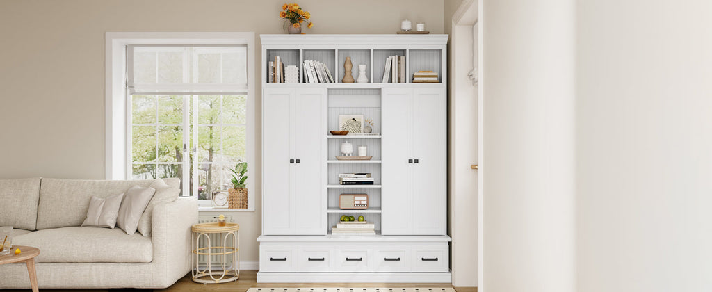 • Central storage and shelving: Featuring two enclosed cabinets located on each side of the central. And the middle portion of the hall tree includes four open shelving units that provide even more storage options. Ideal for storing or displaying books, baskets, shoes, or other items that benefit from easy accessibility. Totally, there are five shelves are adjustable, allowing for a personalized layout to maximize storage space.