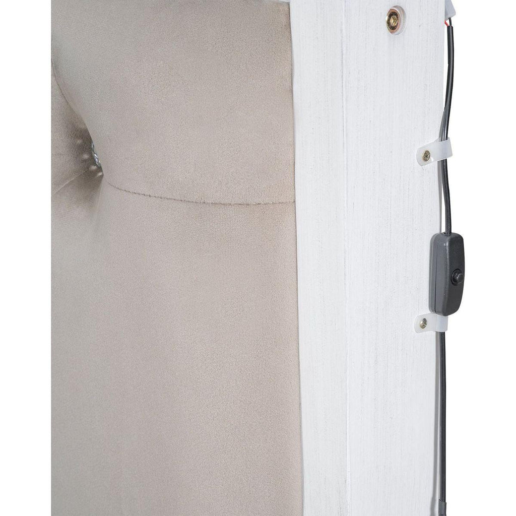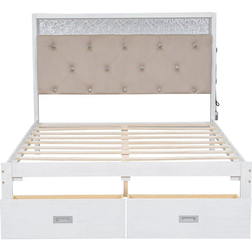 Wood Queen Size Platform Bed with Upholstered Headboard and LED and 2 Drawers, Antique White