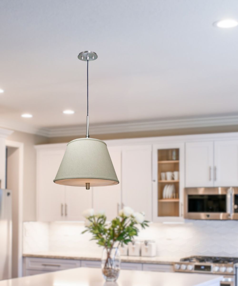 The 16" Satin Nickel Pendant Light with Empire Textured Oatmeal Slotted Pendant Shade and Diffuser is a perfect blend of classic elegance and modern design. The sleek satin nickel finish adds a touch of sophistication, while the empire-shaped shade in a textured oatmeal fabric brings warmth and charm to any room. The minimalist design ensures it complements a variety of decor styles, from contemporary to traditional.