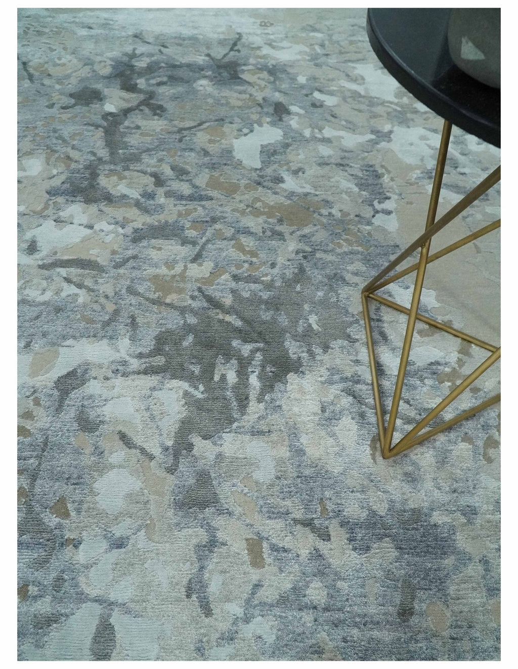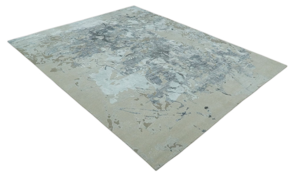 This 8x10 abstract area rug, handcrafted from a blend of wool and art silk, is elegantly designed with beige, ivory, and charcoal colors. The modern and intricate pattern brings sophistication to your space, while the wool and silk construction offers resilience and softness.