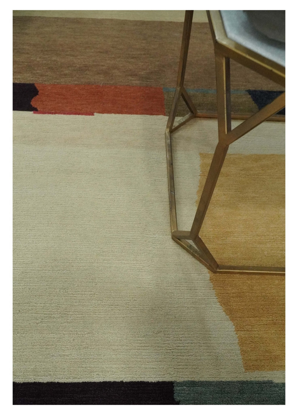 This modern and abstract hand-knotted 5x6.6 wool area rug is designed in a classic color palette of brown, ivory, beige and rust. These colors bring a unique natural texture to any room. The wool material lends a gentle softness to your floor.