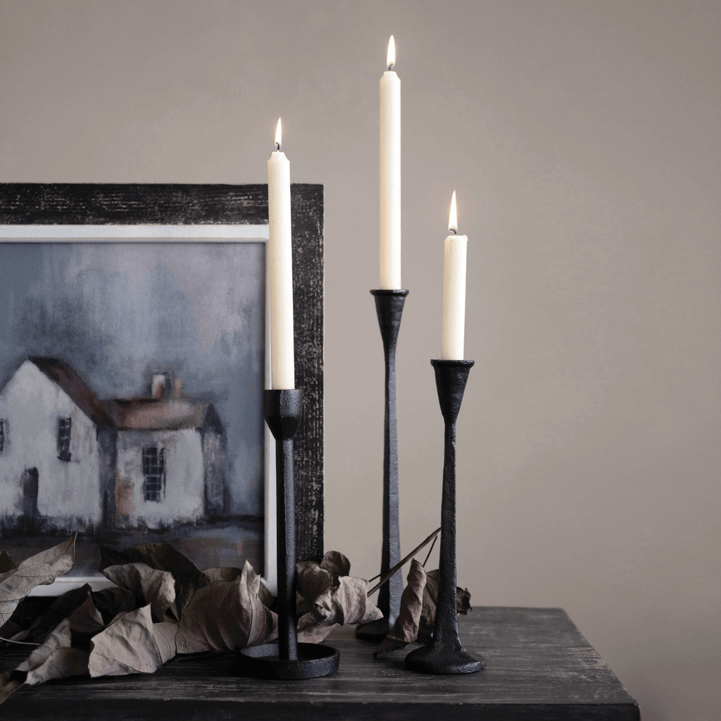 This cast iron taper holder is trendy, rustic, and eclectic, definitely not your run of the mill candlestick. Its classic black cast iron finish will complement many styles from urban modern to industrial. Pair with similar or different styles and shapes to make your unique candlelit display.