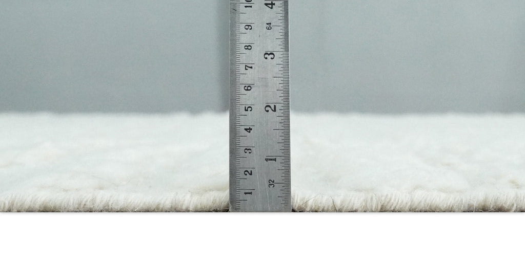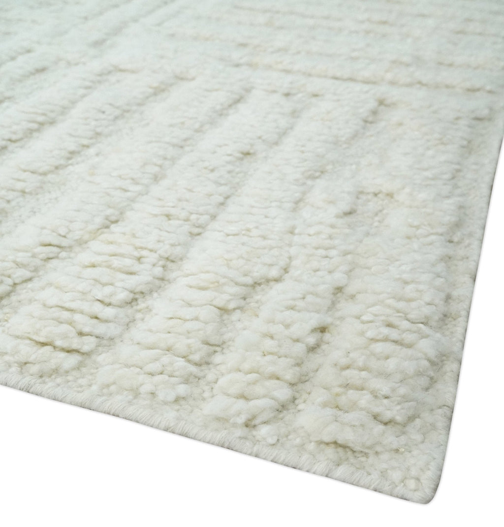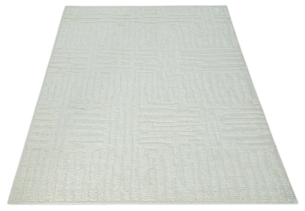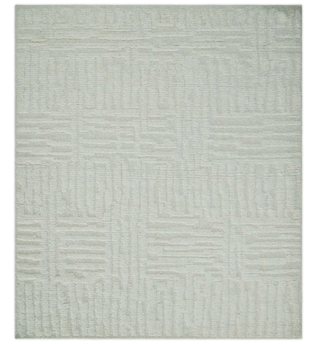 A contemporary high texture Hand knotted Ivory wool Area Rug is perfect for adding a timeless touch to any living area. Matching any décor, the unique design is hand-knotted using 100% wool for a luxurious silk-like finish. The 8.6x9.10 size is perfect for larger living areas, creating a classic atmosphere.